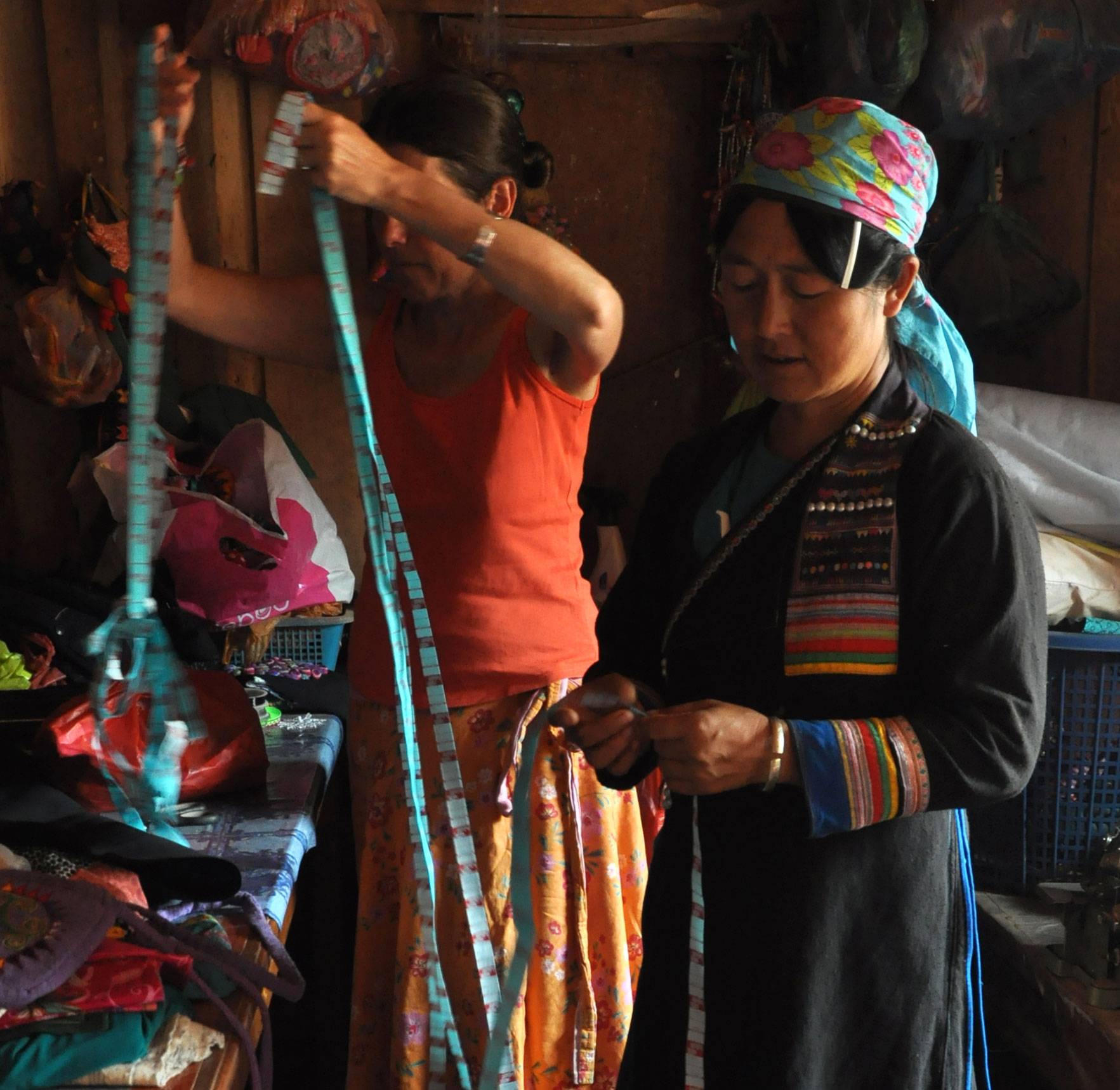 Notre catalogue n’est qu’une vitrine de l’esprit, de la tendance dans laquelle nous travaillons avec nos « créatrices ». Nous sommes attachés à cette petite production artisanale, qui s’insère, sans trop la perturber, au sein d’une vie paysanne et familiale. Il n’est pas question pour nous, de bouleverser la vie du village, d’en sortir les femmes pour les faire travailler en atelier, les poussant à produire en fonction du seul calendrier de commandes et de revenus monétaires qui seraient à amplifier sans discernement. Aussi il nous est impossible d’exiger une qualité parfaite pour un travail réalisé sur un sentier de montagne, et les commandes doivent parfois accepter des délais dus aux exigences du calendrier agricole !