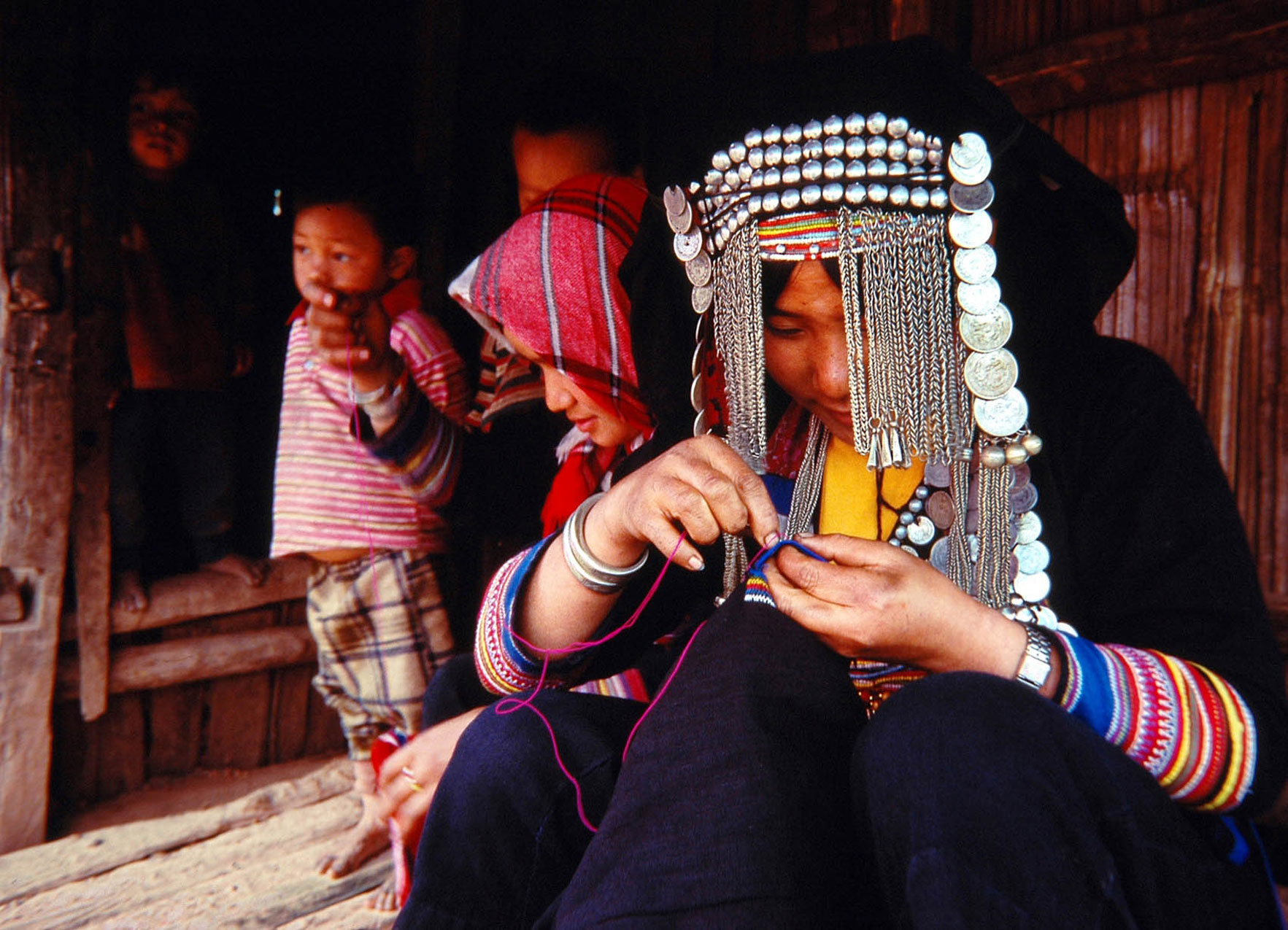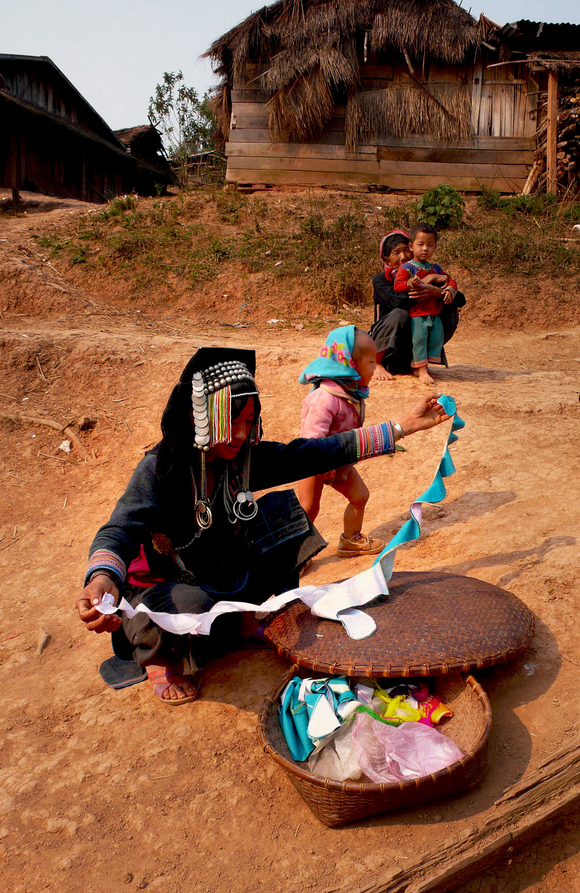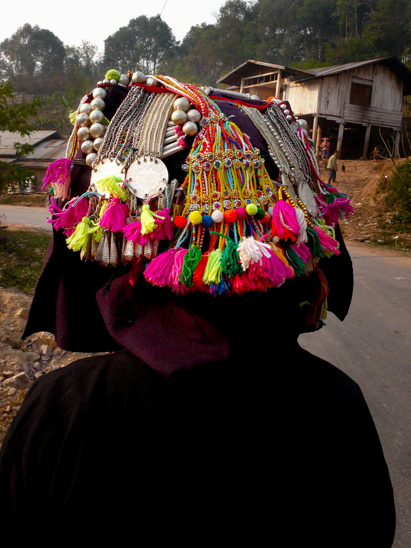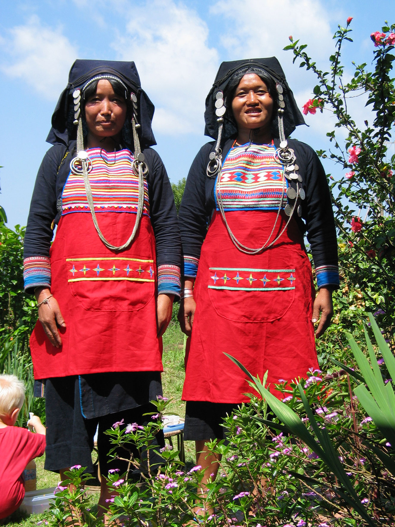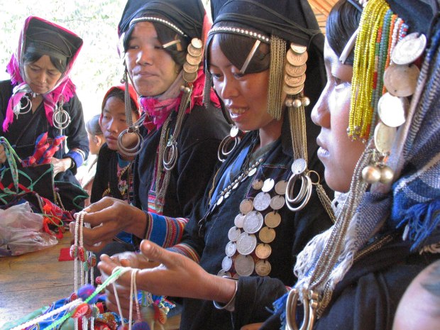 Les femmes Akha se reconnaissent facilement à leur costume. Leurs longues tuniques noires sont décorées de broderies, perles, pièces de monnaie et de différentes babioles.