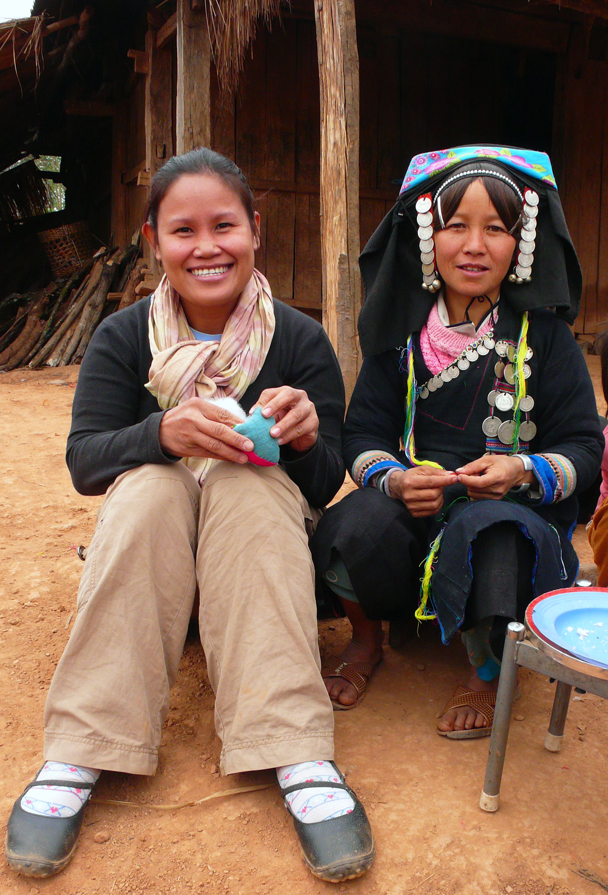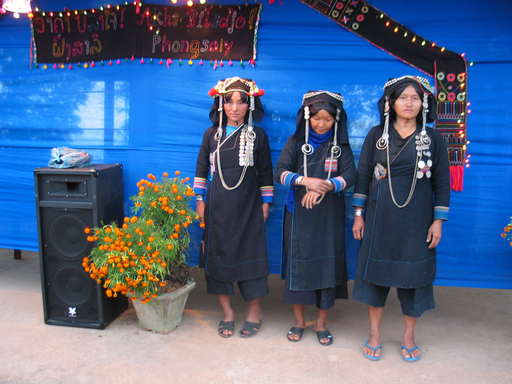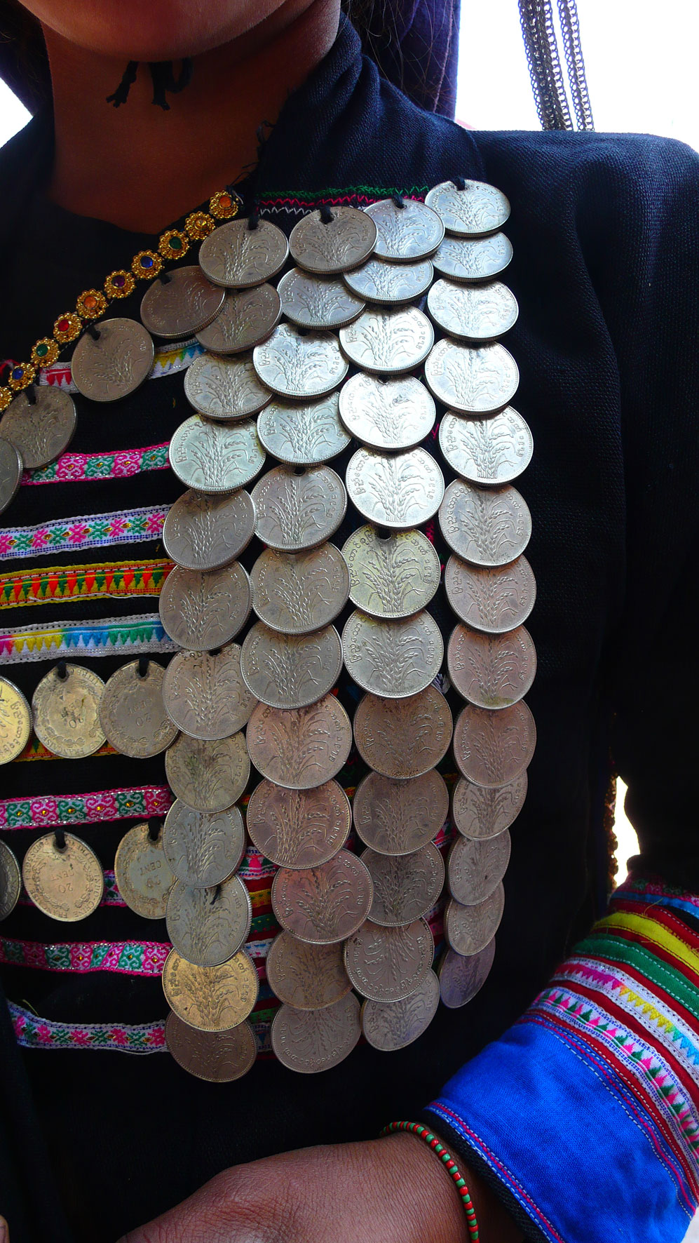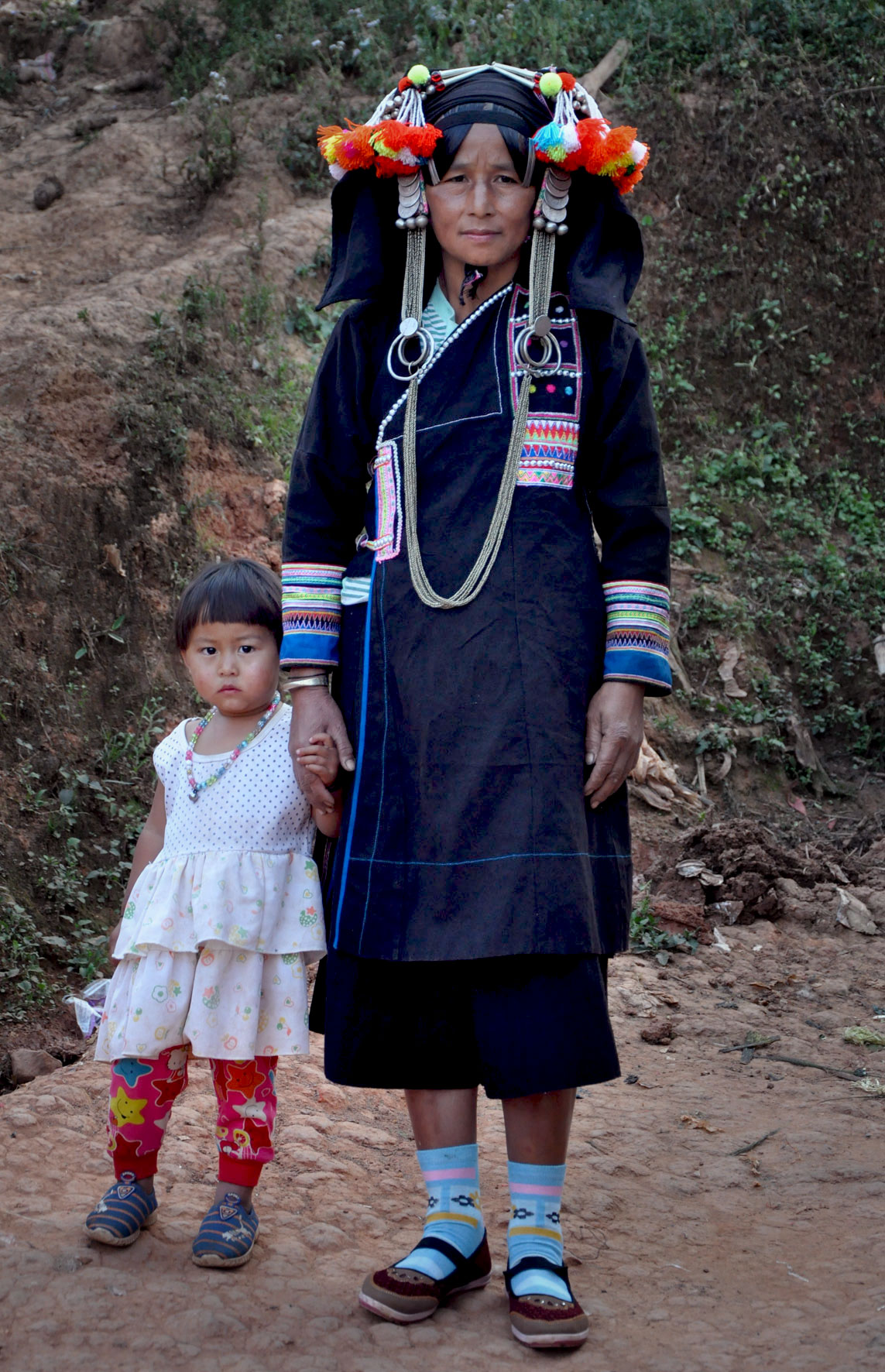 Les femmes Akha se reconnaissent facilement à leur costume. Leurs longues tuniques noires sont décorées de broderies, perles, pièces de monnaie et de différentes babioles.