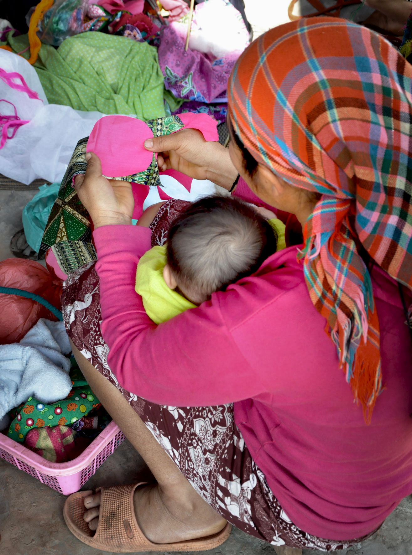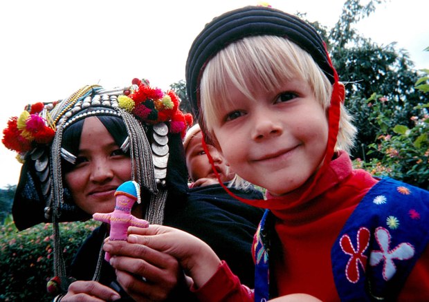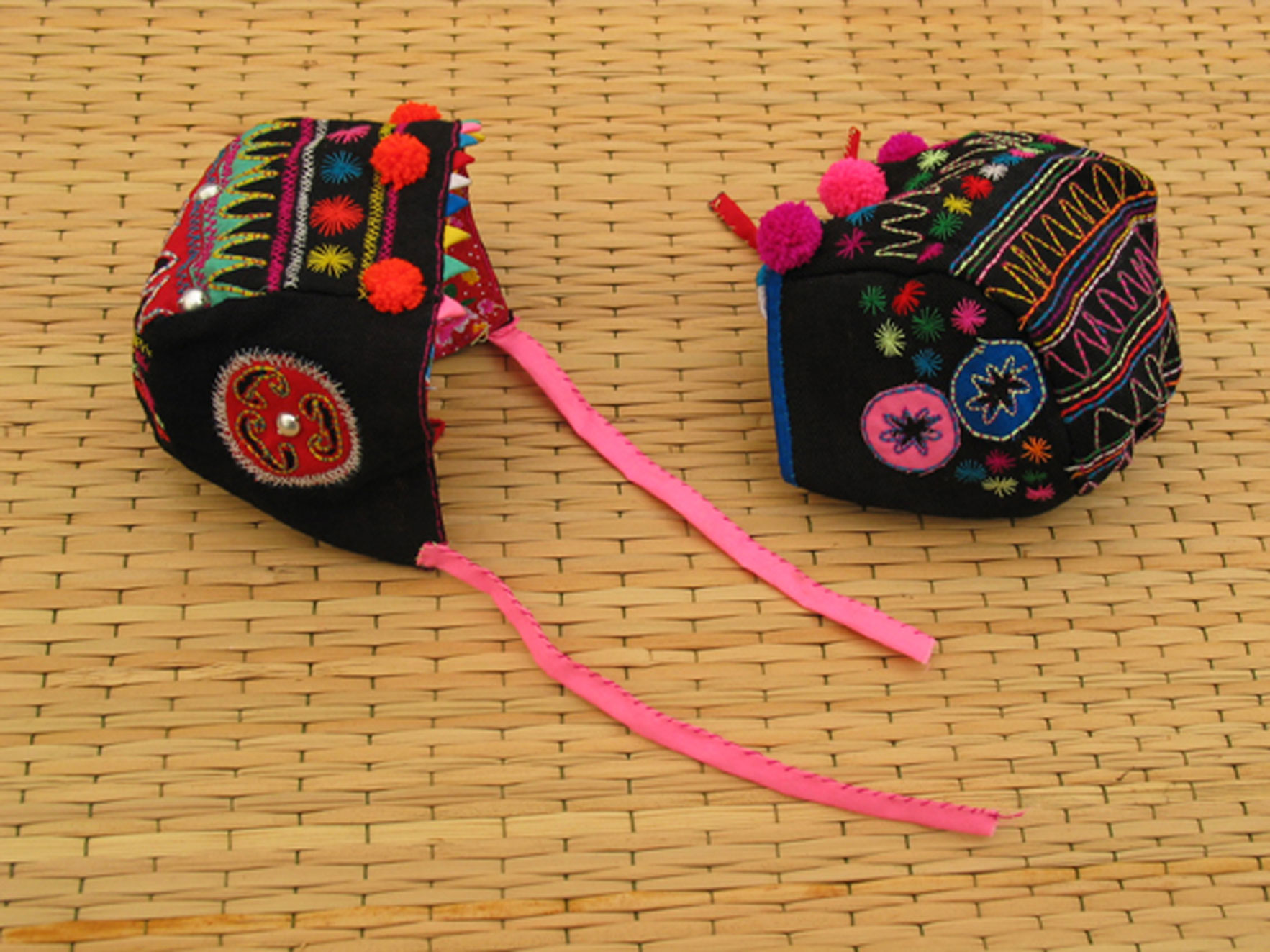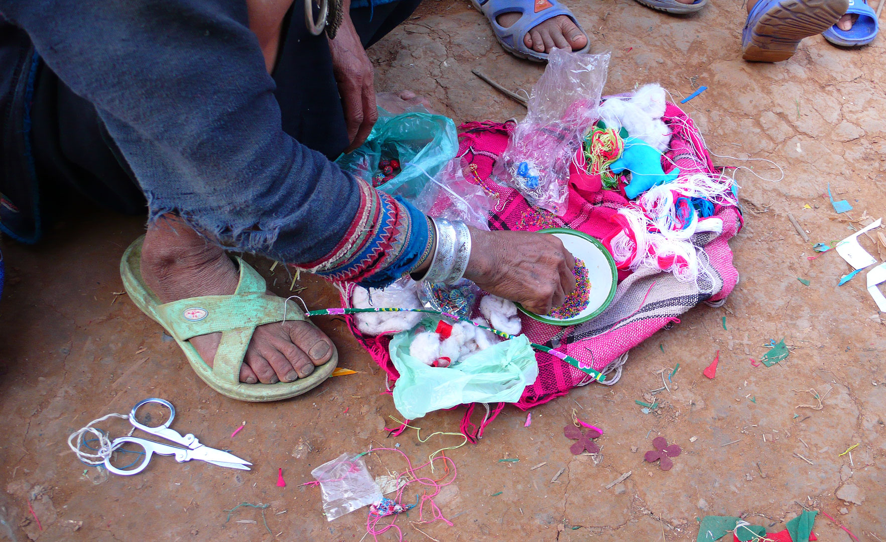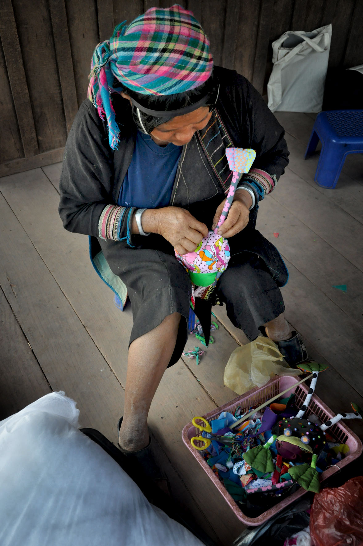« J’habitais dans un village du nord du Laos et, chaque matin, des femmes Akha débarquaient à la maison, leur hotte chargée de choux. Voyant que je m’intéressais à leurs broderies, elles tentaient, chacune à leur tour, de me vendre leur costume, n’ayant pas d’autres supports brodés à me proposer. Au fil des mois, je les ai initiées à la réalisation de petits objets plus facilement commercialisables. Avec une étonnante vitalité, elles ont appliqué leurs techniques traditionnelles à ces objets nouveaux, y apportant leur style bien particulier et leur talent pour assortir les couleurs. »