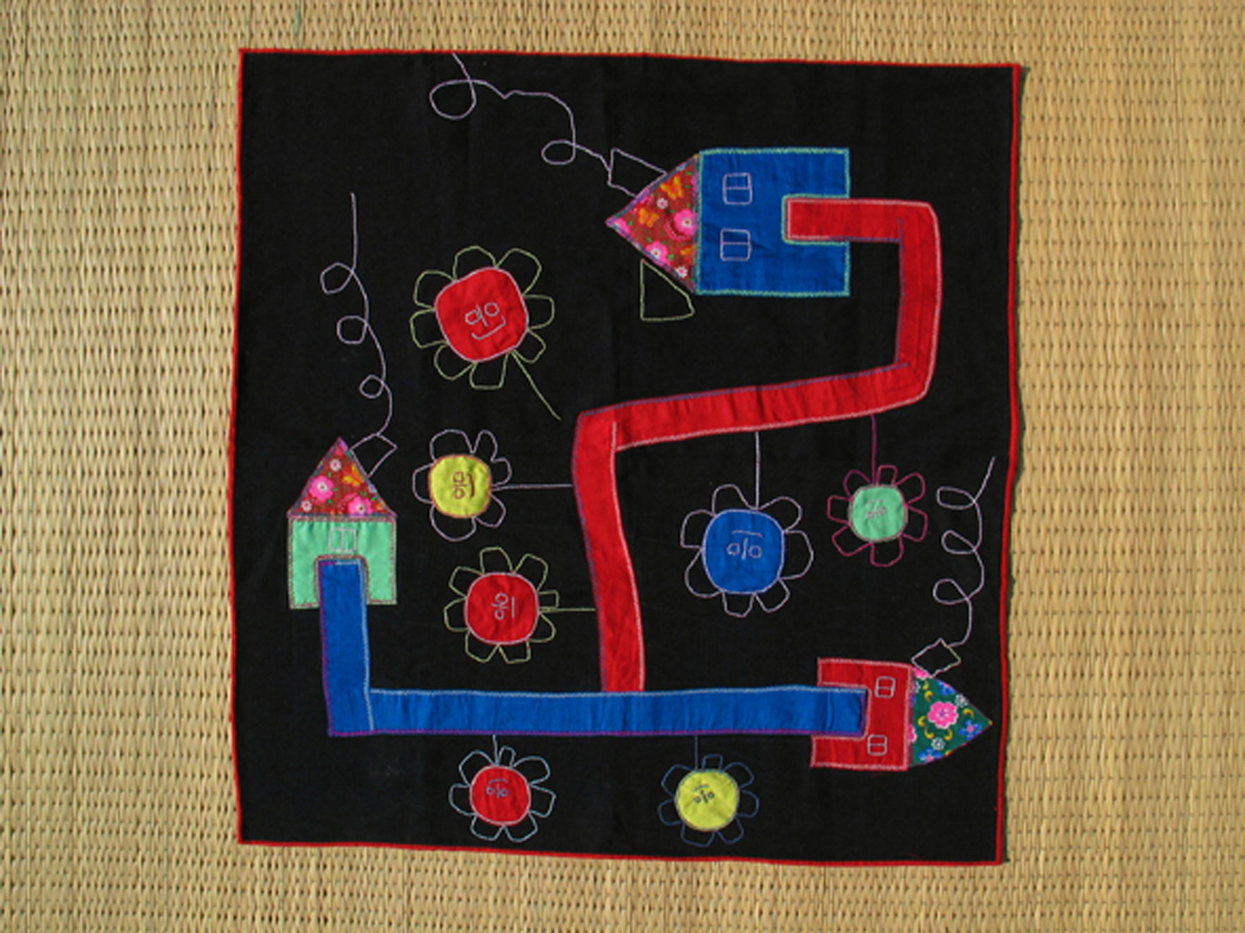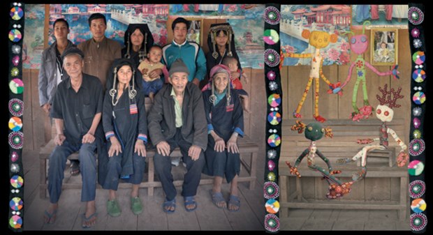 « Nous sommes en 2006, déjà plusieurs années d’échange de savoir-faire, de travail quotidien avec les femmes Akha au Laos, sans oublier les liens d’amitié et l’implication d’une autre artiste intrépide, Annouck Lepla, ont donné naissance à un univers coloré, peuplé de personnages et de bestioles brodées. »