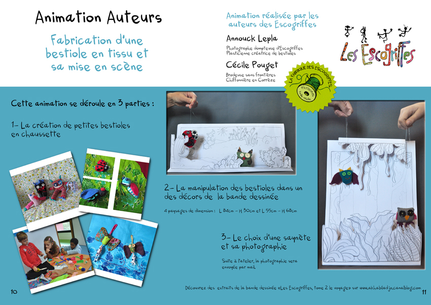 Nous proposons une exposition en présence des Escogriffes pour découvrir les étapes de fabrication du livre, de la création des personnages à l’impression de la bande dessinée.