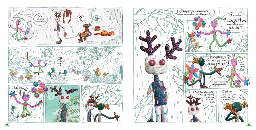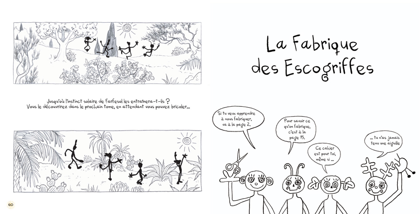 Les Escogriffes vivent au même endroit mais à des saisons différentes. Ils ne se sont jamais rencontrés, jusqu’au jour où Farfesol le fou de soleil s’égare dans le brouillard glacé. Il rencontrera tour à tour Biscorneige le cornu des brumes, l’Hurlufleurie la chantonnante, Voltefeuille la virevoltante…